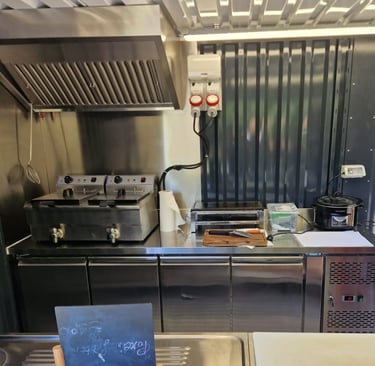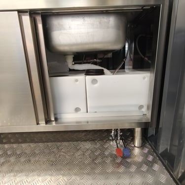 Non avendo un'installazione fissa la necessità di avere acqua calda e fredda sempre disponibili è stata soddisfatta con una doppia alimentazione, da rete idrica e con due vasche d'acqua pulita/sporca.