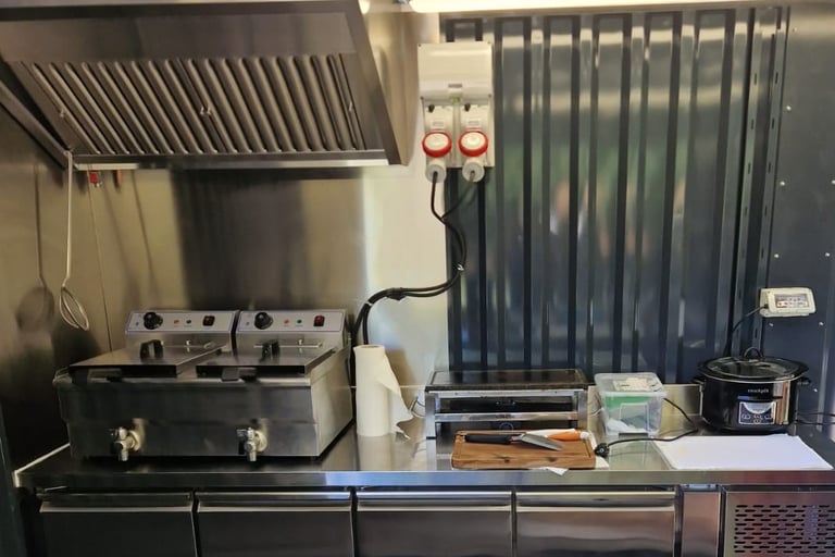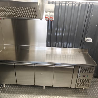 Un angolo cottura completamente in inox semplice e pulito con cappa industriale e doppia presa da 16A e banco frigo negativo.
